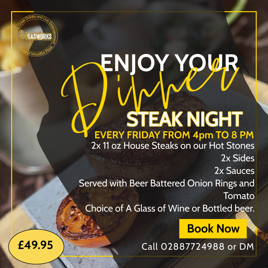 2 x 11oz House Steaks on our Hot Stones, 2 x sides, 2 x Sauces, Onion Rings and Glass of Wine or Bottled beer
